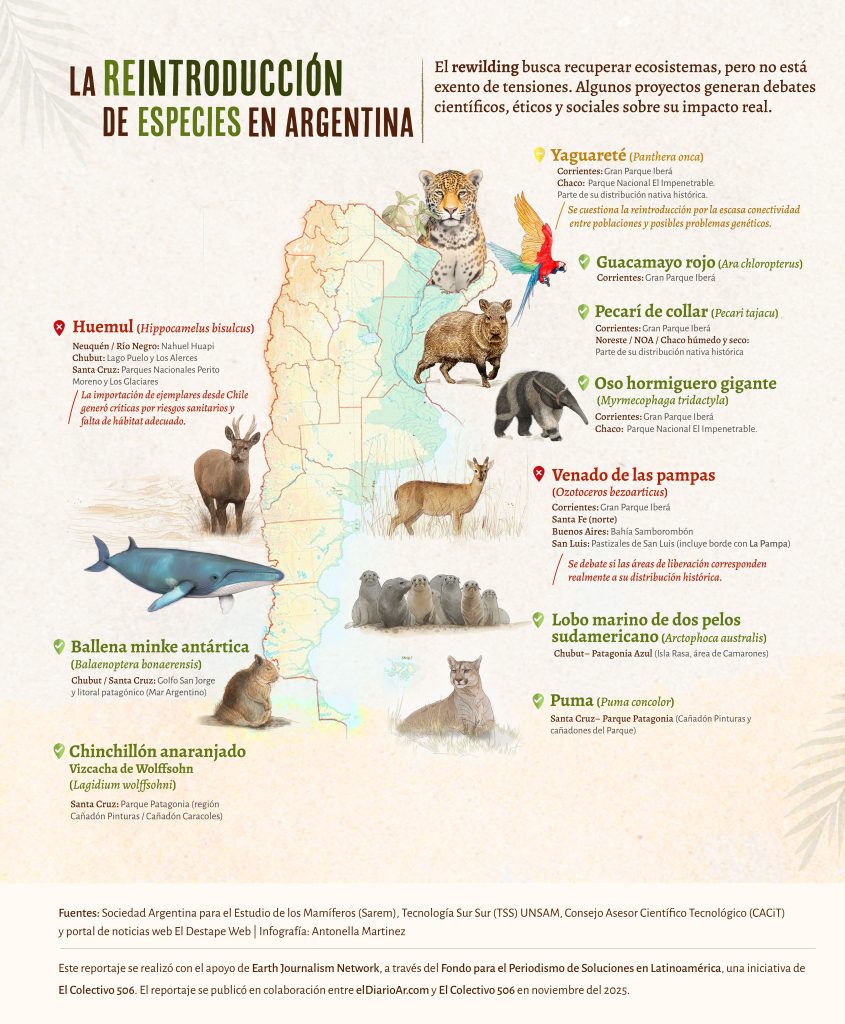 La reintroducción de especies extintas en áreas protegidas de Argentina es destacada por organismos internacionales—pero esta estrategia de restauración ecológica enfrenta controversias y desafíos que ponen a prueba la capacidad de continuidad y diálogo entre la ciencia, el Estado y las comunidades. La periodista Cecilia Fernández Castañón narra la historia en este artículo, creado con el apoyo del Earth Journalism Network mediante Fondo para el Periodismo de Soluciones en Latinoamérica, una iniciativa de El Colectivo 506. El artículo fue publicado por Ambientenea el 12 de noviembre del 2025.