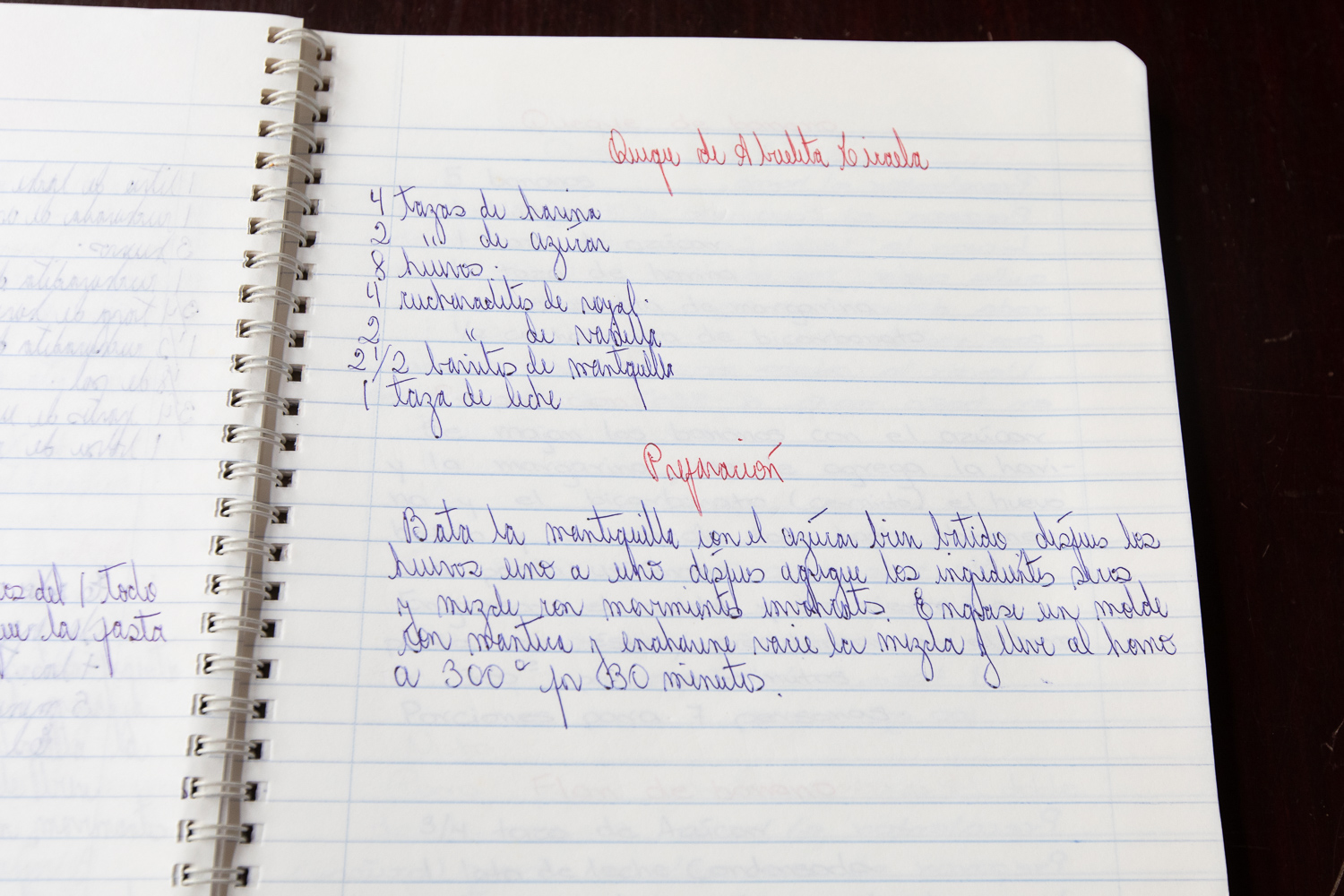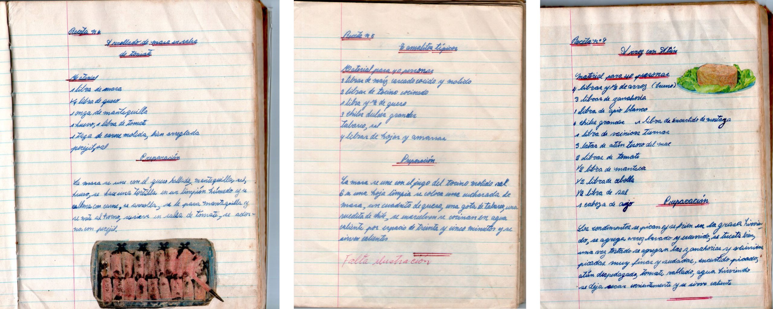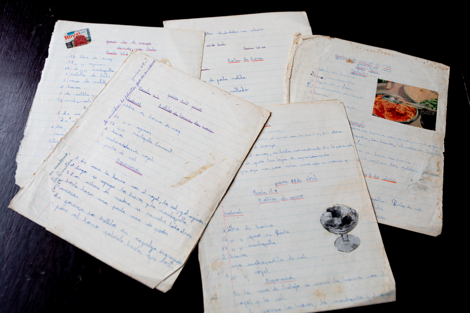 Sandra Flores, vecina de barrio Otoya y Aranjuez, San José, guardó por años algunas de las recetas de sus clases escolares de cocina recibidas en el Edificio Metálico, en los finales de la década de los 50. Cocinó algunas de ellas durante la crianza y juventud de sus hijos, y su inquietud por la cocina la aumentó con clases privadas de platos dulces y salados.
