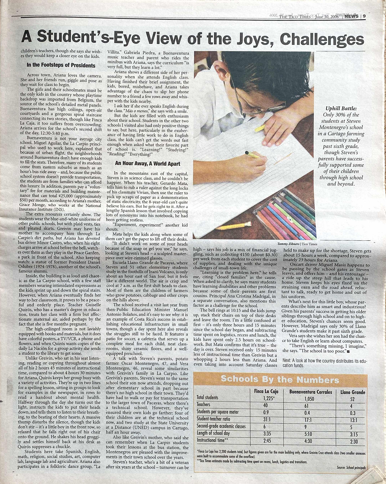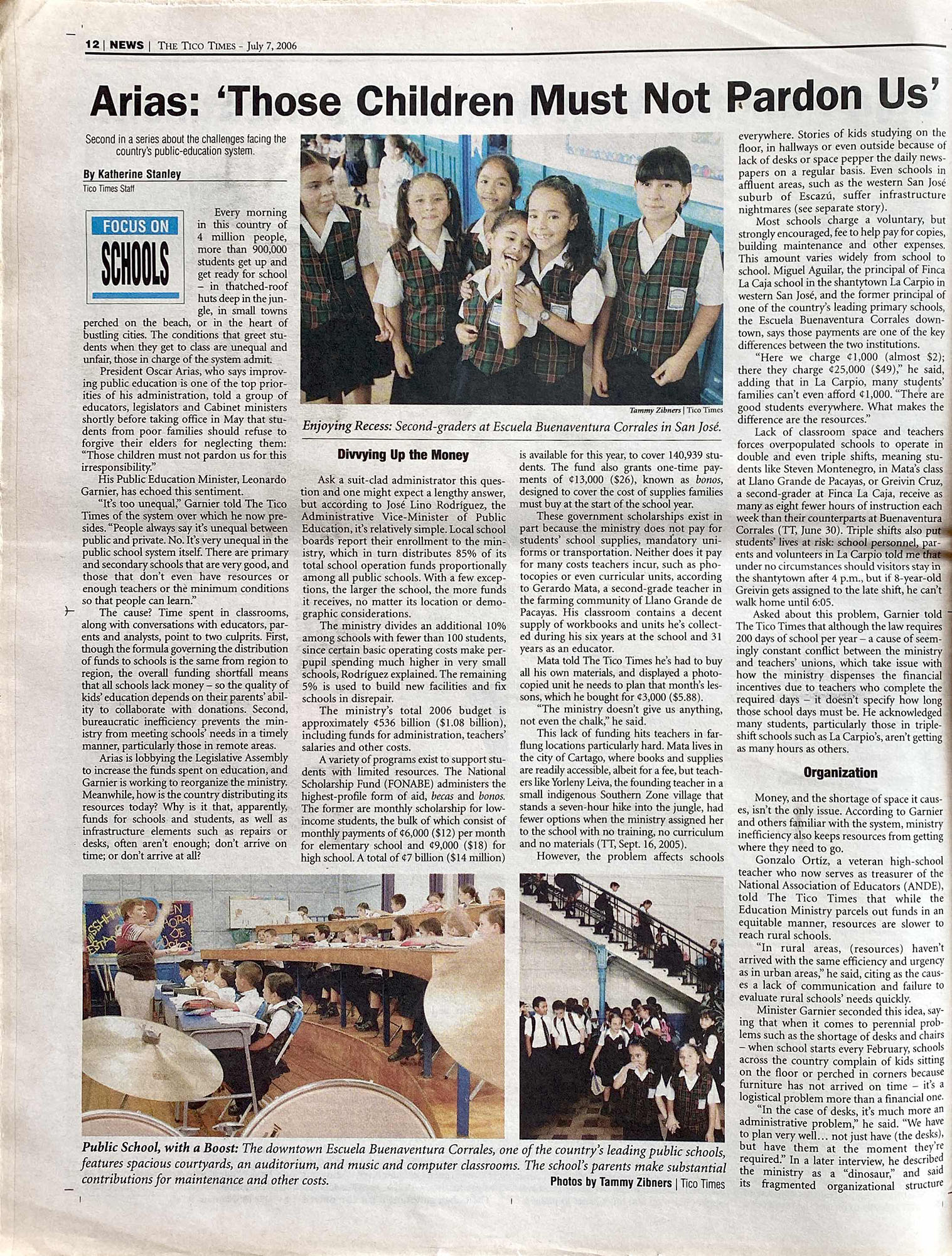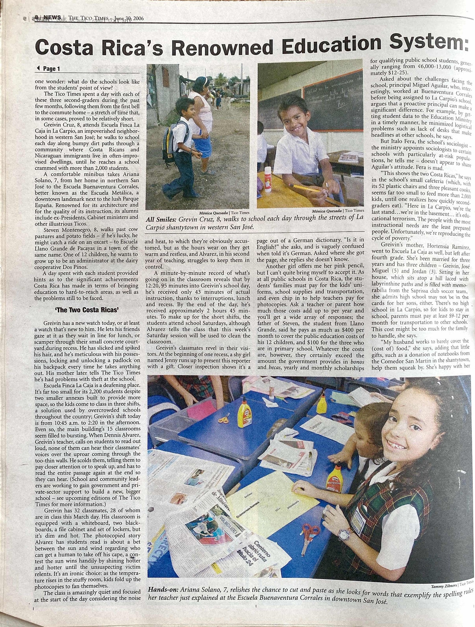 “Greivin Cruz, 8, attends Escuela Finca La Caja in La Carpio, an impoverished neighborhood in western San José; he walks to school each day along bumpy dirt paths through a community where Costa Ricans and Nicaraguan immigrants live in often-improvised dwellings, until he reaches a school crammed with more than 2,000 students,” read the article published by The Tico Times on June 30, 2006. “A comfortable minibus takes Ariana Solano, 7, from her home in northern San José to the Escuela Buenaventura Corrales, better known as the Escuela Metálica, a downtown landmark next to the lush Parque España. Renowned for its architecture and for the quality of its instruction, its alumni include ex-Presidents, Cabinet ministers and other illustrious Ticos.