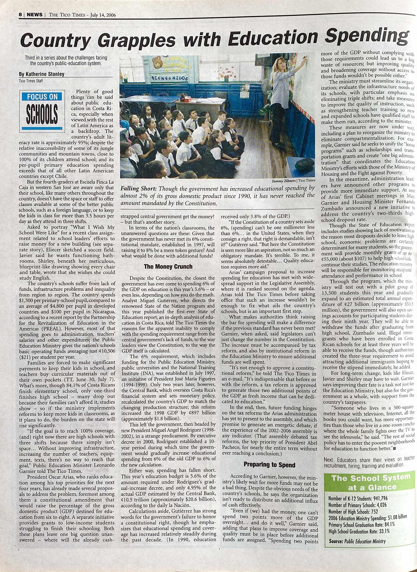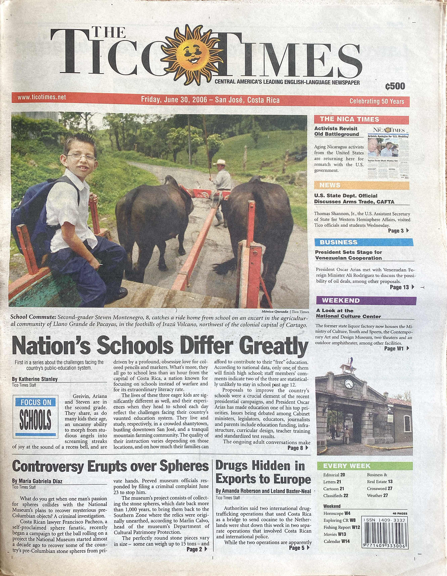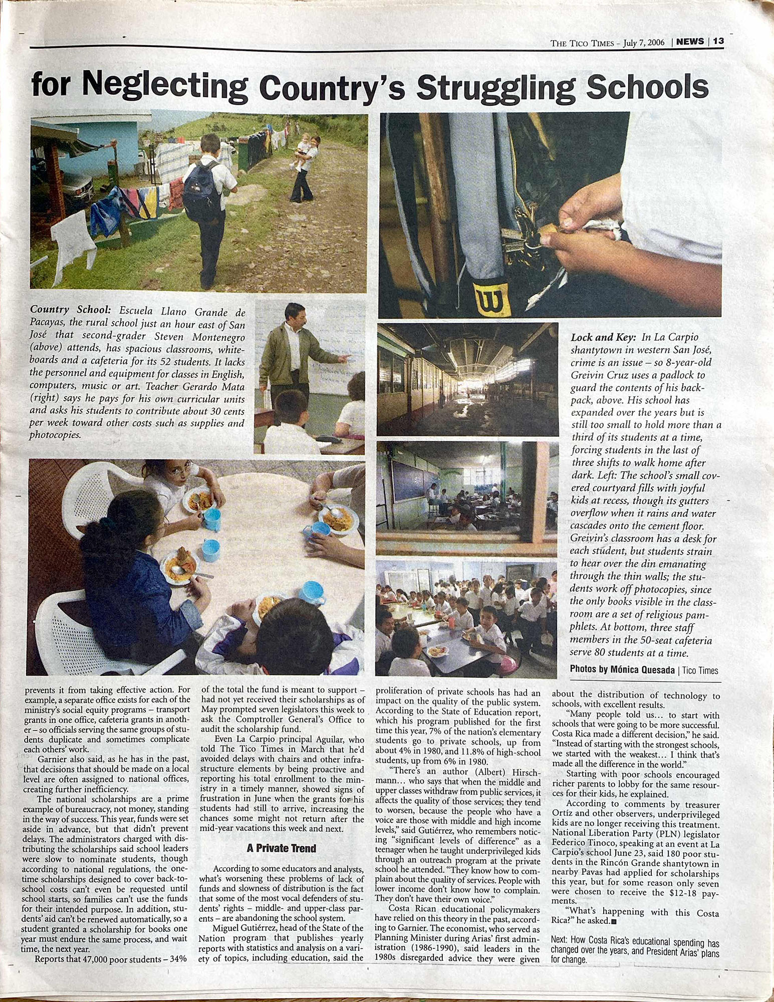“Greivin Cruz, 8, attends Escuela Finca La Caja in La Carpio, an impoverished neighborhood in western San José; he walks to school each day along bumpy dirt paths through a community where Costa Ricans and Nicaraguan immigrants live in often-improvised dwellings, until he reaches a school crammed with more than 2,000 students,” read the article published by The Tico Times on June 30, 2006. “A comfortable minibus takes Ariana Solano, 7, from her home in northern San José to the Escuela Buenaventura Corrales, better known as the Escuela Metálica, a downtown landmark next to the lush Parque España. Renowned for its architecture and for the quality of its instruction, its alumni include ex-Presidents, Cabinet ministers and other illustrious Ticos.