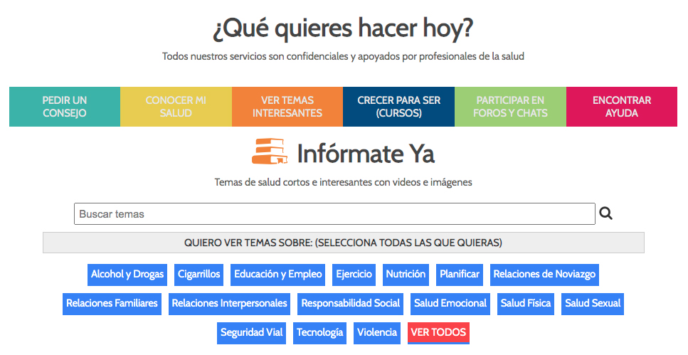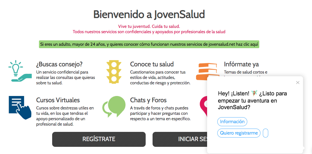 Although TSI was created in 2004 by the Costa Rican-U.S. citizen Cathy Strachan, it was not until 2010 that the JovenSalud digital platform materialized. Today, the platform includes self-assessment questionnaires; self-paced online courses; comprehensive health information and resources in a virtual library; and professional guidance, provided one-on-one and through online forums.