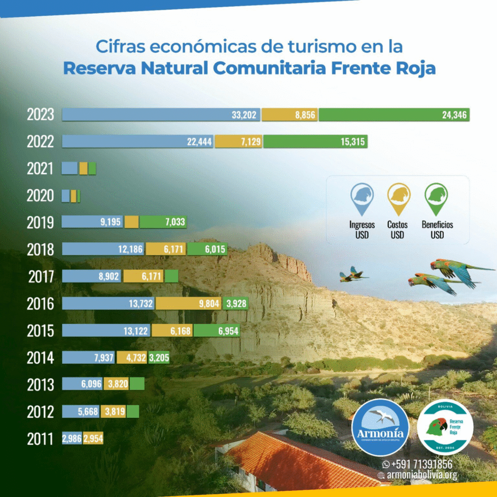 «La Reserva Frente Roja en realidad es un territorio netamente de las comunidades y que ellos han sido quienes han dispuesto parte de su territorio para poder destinar como una Reserva Natural Comunitaria», explica Guido. «Ellos son dueños del territorio, el albergue turístico también es parte de ellos, entonces todo el proyecto en sí es de las comunidades. Nosotros como Proyecto y Armonía somos un soporte técnico de apoyo».