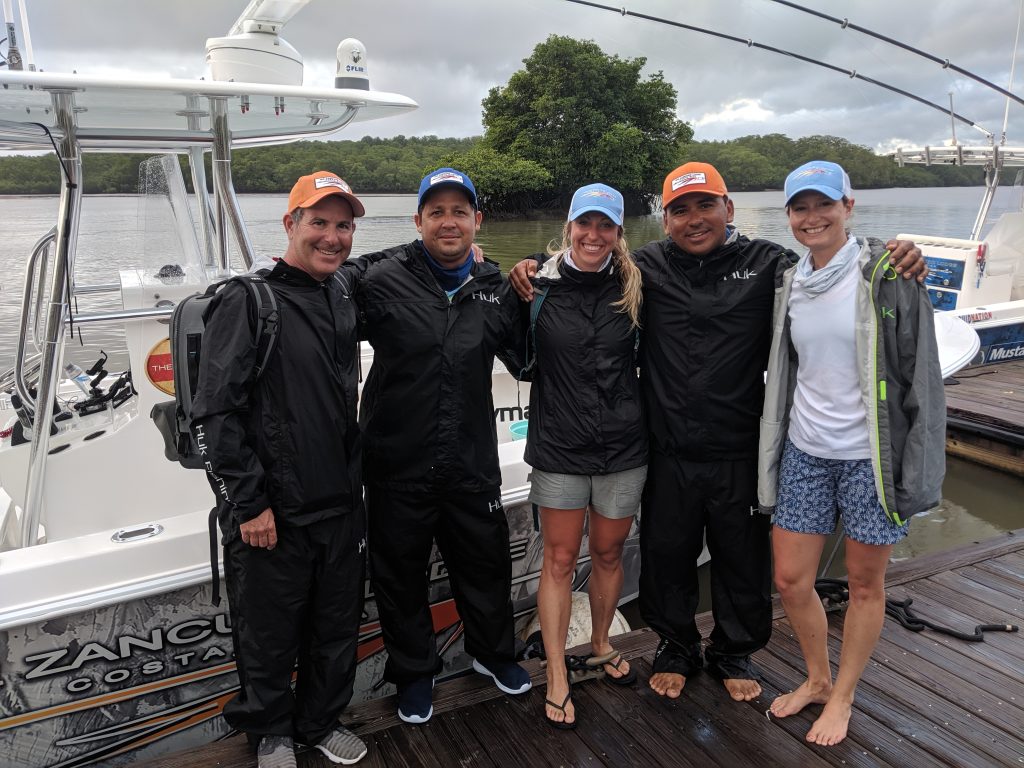 Dra. Danielle Bates (der) y Dra. Hannah Blondin (centro) con el equipo de Zancudo Lodge, quienes ayudaron a pescar peces picudos para marcar y colocar etiquetas satelitales. Cortesía Danielle Bates / El Colectivo 506
