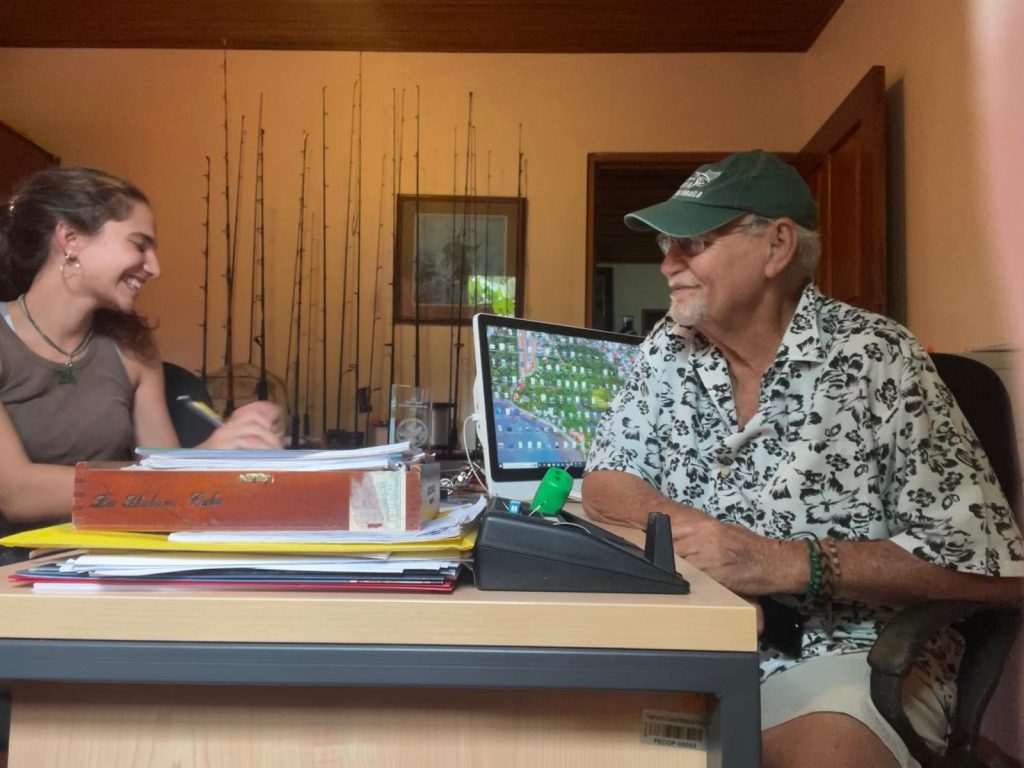Daviana Berkowitz, estudiante de doctorado de Stanford, entrevista al fallecido Todd Staley (de FECOP) para recopilar conocimientos ecológicos locales sobre la pesquería de picudos. Cortesía Danielle Bates / El Colectivo 506