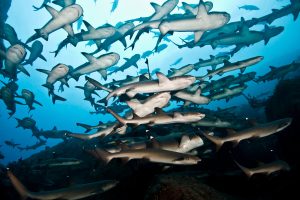 Puntas blancas surfeando la corriente en Manuelita. Fuente: https://isladelcoco.go.cr/galeria/