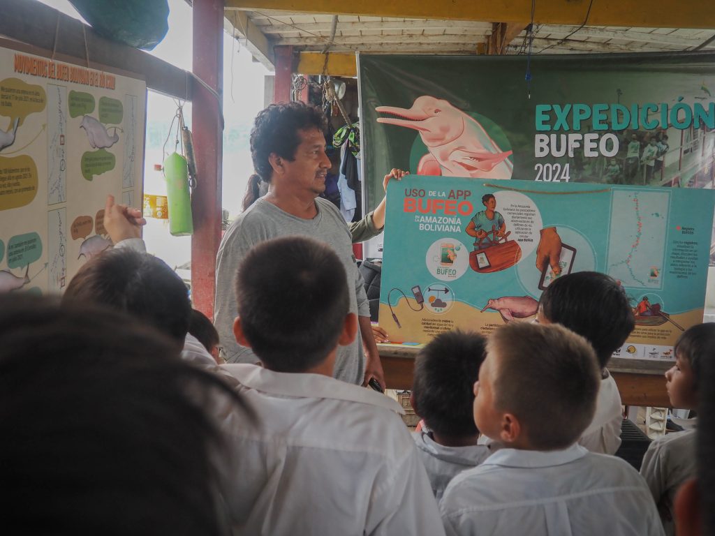 El bufeo (Inia boliviensis) es una especie Vulnerable (VU), según el Libro Rojo de los Vertebrados de Bolivia. Tras décadas de conservación mínima, Faunagua fue una de las primeras organizaciones ambientales que comenzó a estudiarla, emprendió proyectos de protección y creó esta aplicación para que los pescadores, que conviven a diario con este delfín rosado, puedan ser parte de su resguardo. De esta manera, logran recolectar información para un banco de datos sobre el mamífero y, paralelamente, toman medidas de la calidad del agua y del aire, ya que en cada embarcación hay estaciones de monitoreo.