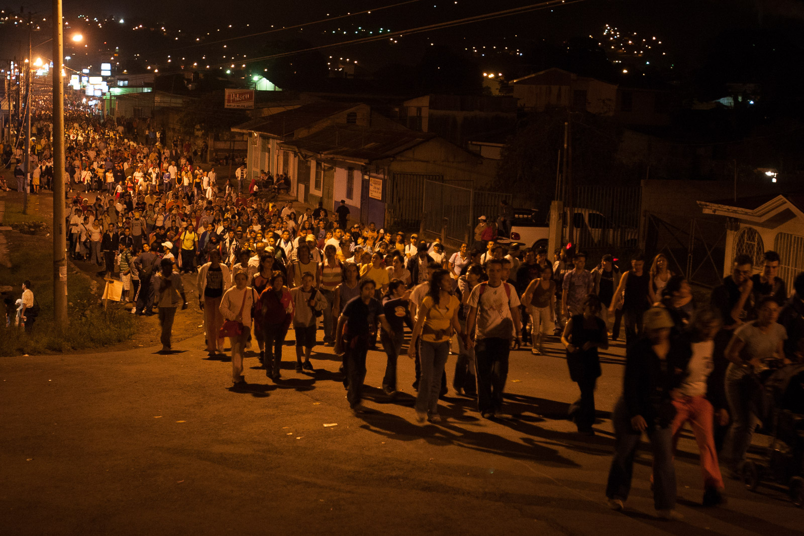 Si bien la romería no es una experiencia religiosa para mí, uso la caminata como una oportunidad para pensar en las cosas por las que estoy agradecida en un sentido general. Este año estoy celebrando 18 años en Costa Rica, y la caminata se siente como un tributo adecuado a eso, porque encapsula a la Costa Rica urbana. Pequeños fragmentos de vida destellan frente a mí, momentos brillantes en medio de la noche. Me encantan los atisbos que se obtienen desde las calles oscuras de portales luminosos y salas de estar, de rostros que desde adentro miran hacia la multitud que pasa, como una señora que se apoya en un poste en su patio, con un delantal a cuadros.