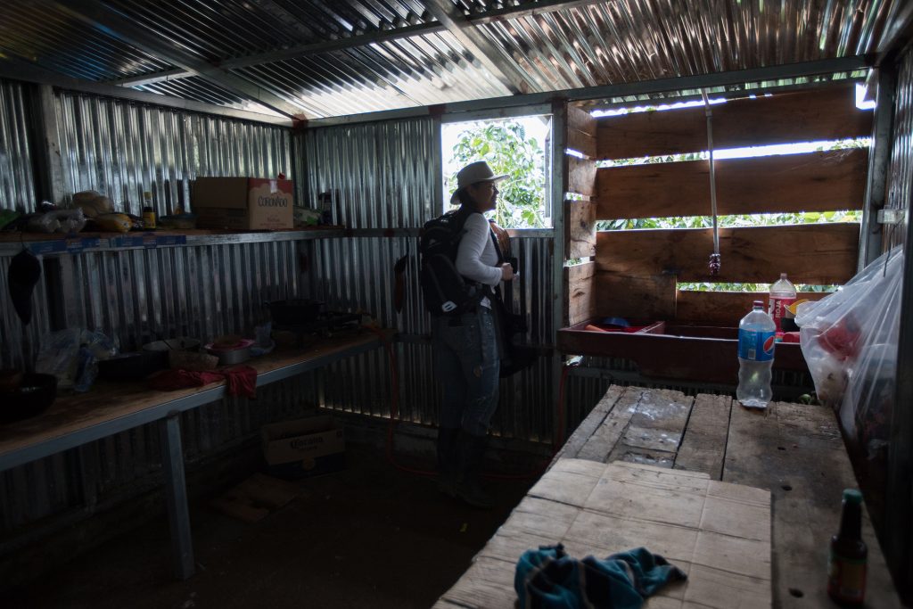 Mientras que el jóven de 22 años permanece de pie entre las sombras y el humo de la leña, en el espacio techado fuera de los dormitorios donde los recolectores del café están cocinando sobre el fuego en un largo canal de cemento, un grupo de hombres al otro lado del camino sigue mirando hacia arriba con sonrisas astutas y bromas. Les resulta gracioso que dos periodistas estén interrogando a Sergio, una con una cámara apuntando a él mientras habla. El propio Sergio parece levemente avergonzado, pero dispuesto a hablar. Ha estado recogiendo café todo el día en Finca La China, una de las fincas más grandes en la región fronteriza de Coto Brus, en el sur de Costa Rica.
