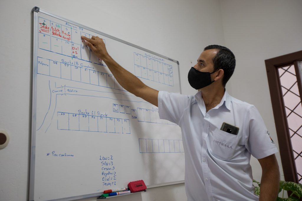 Maikol nos explica cómo estuvo del proceso, señalando las marcas de la pizarra que muestran cómo los trabajadores estaban aislados y movidos. Los casos de Río Negro fueron asintomáticos, con pocas excepciones. Uno fue el primer caso y otro fue un trabajador que se desmayó en el campo. Resultó tener COVID-19 y, además, el síndrome de Guillain-Barre. Tuvo que ser trasladado a un hospital de San José para recibir tratamiento en la UCI.