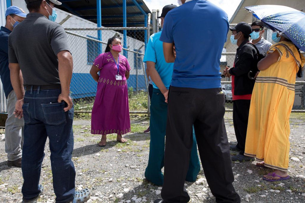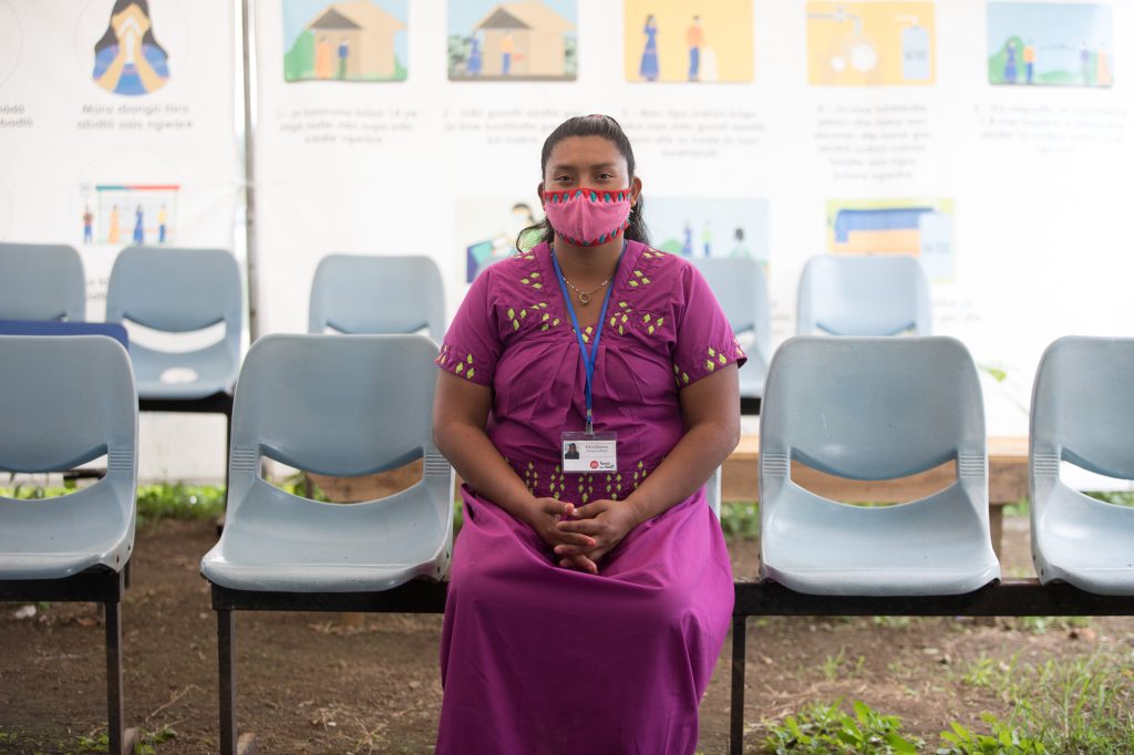 There is actually more noise in this room on a later day, when the border is closed because of the lingering effects of Hurricane Eta on the region. Panamanian authorities are eager to discourage their citizens from attempting to migrate given the dangers posed by swollen rivers and other threats. On that day, Deysi’s dress is bright pink, with green adornments. We find her speaking in rapid Ngäbere to a group of migrants who are clearly frustrated (and whose presence here, on the Costa Rican side, shows the porous nature of this border, as well as the need migrants feel to comply with entry requirements so they can work legally). While they initially express reticence about the idea of being interviewed, they are ushered inside the space that is normally filled with waiting migrants and sit down on the empty benches, heads bowed, accepting foil packets of cookies they are offered by Deysi and by Yandellín Sánchez, a project coordinator for Hands for Health.
