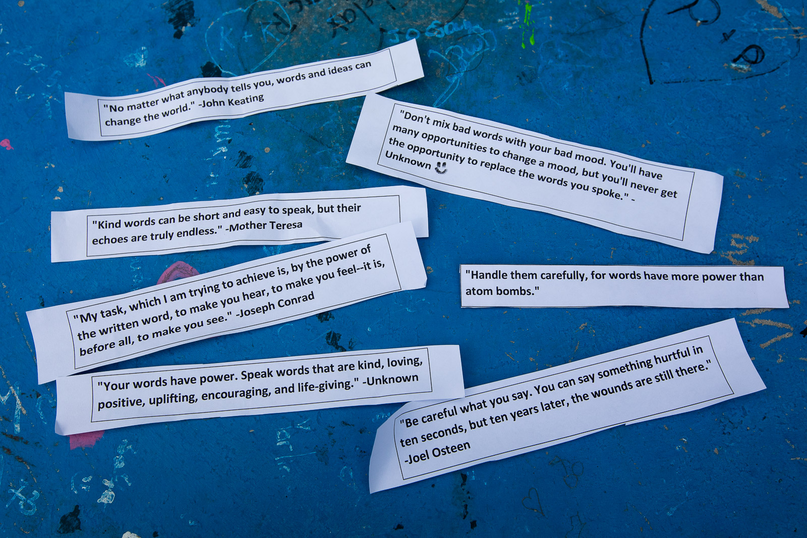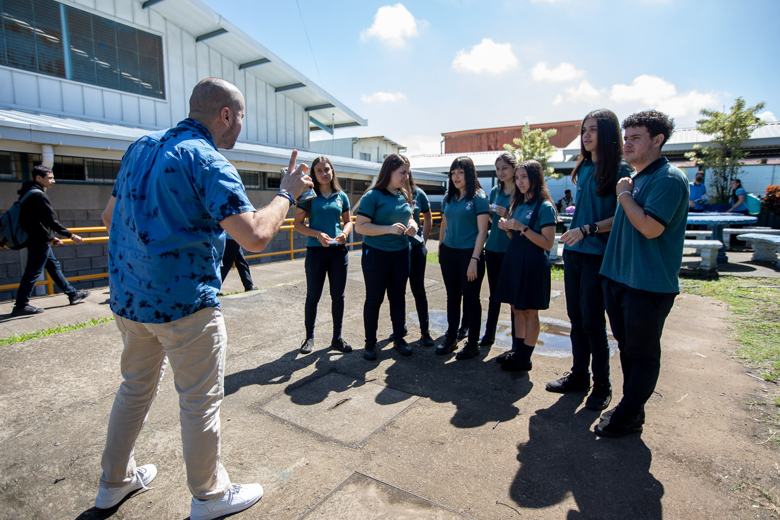 Section 11-2-B is undergoing the same activity, but with Alfonso Moreira Fallas, who now gives them a series of quotes in English on pieces of paper. He invites his students to mingle, heading out of his half-classroom onto the patio. While the teacher plays “November Rain” by Guns N’Roses on the speaker in his hand, the students have to walk in all directions. When the music stops, they have to make groups according to Alfonso’s instructions: for example, “Form a group where only one person has a wristwatch.” Once in the group, they must explain to each other what the quotation they are holding in their hands means. Alfonso jumps from one group to another encouraging them to talk, always in English.