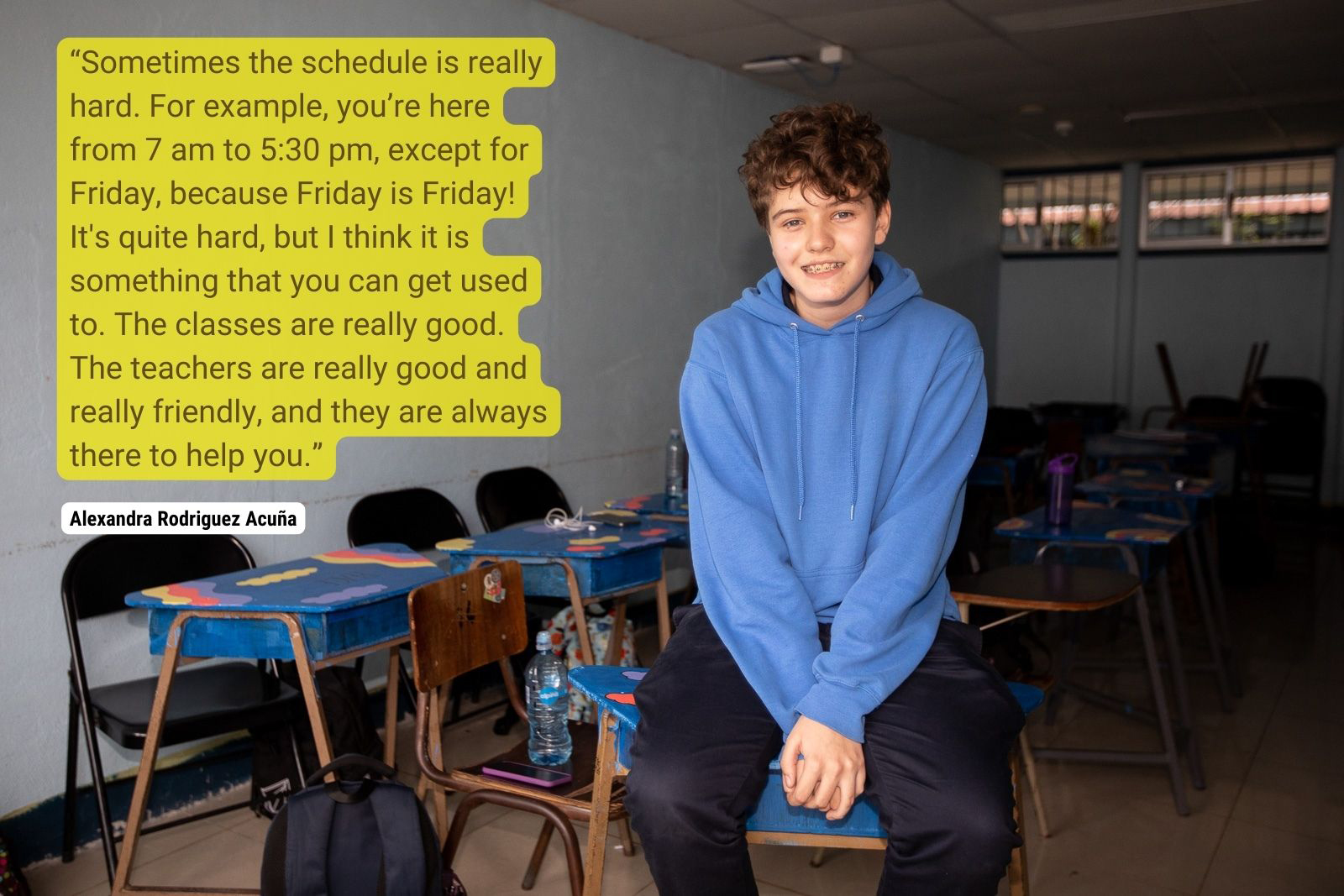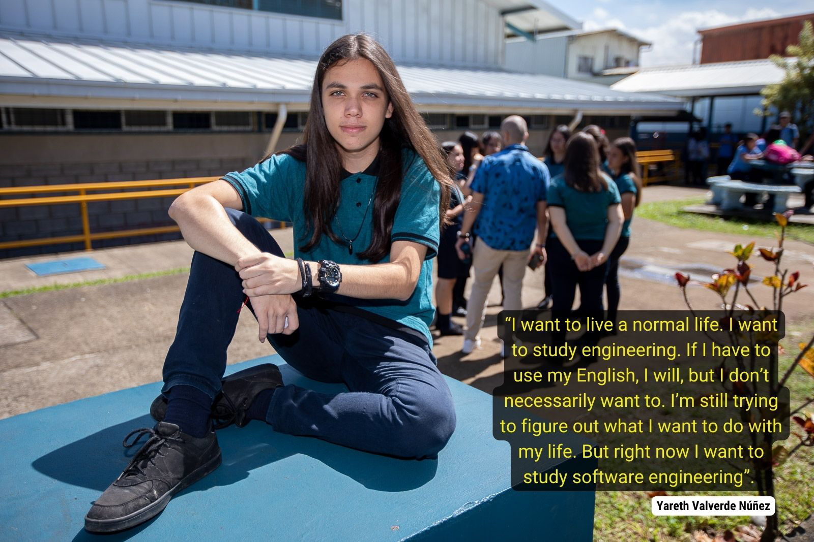“Yes, we come from 7 am sometimes to 5pm. So it’s really hard, you know, but I think it has benefits,” says Mariana Corella Calvo, Yareth’s section partner. She, too, answers entirely in English.