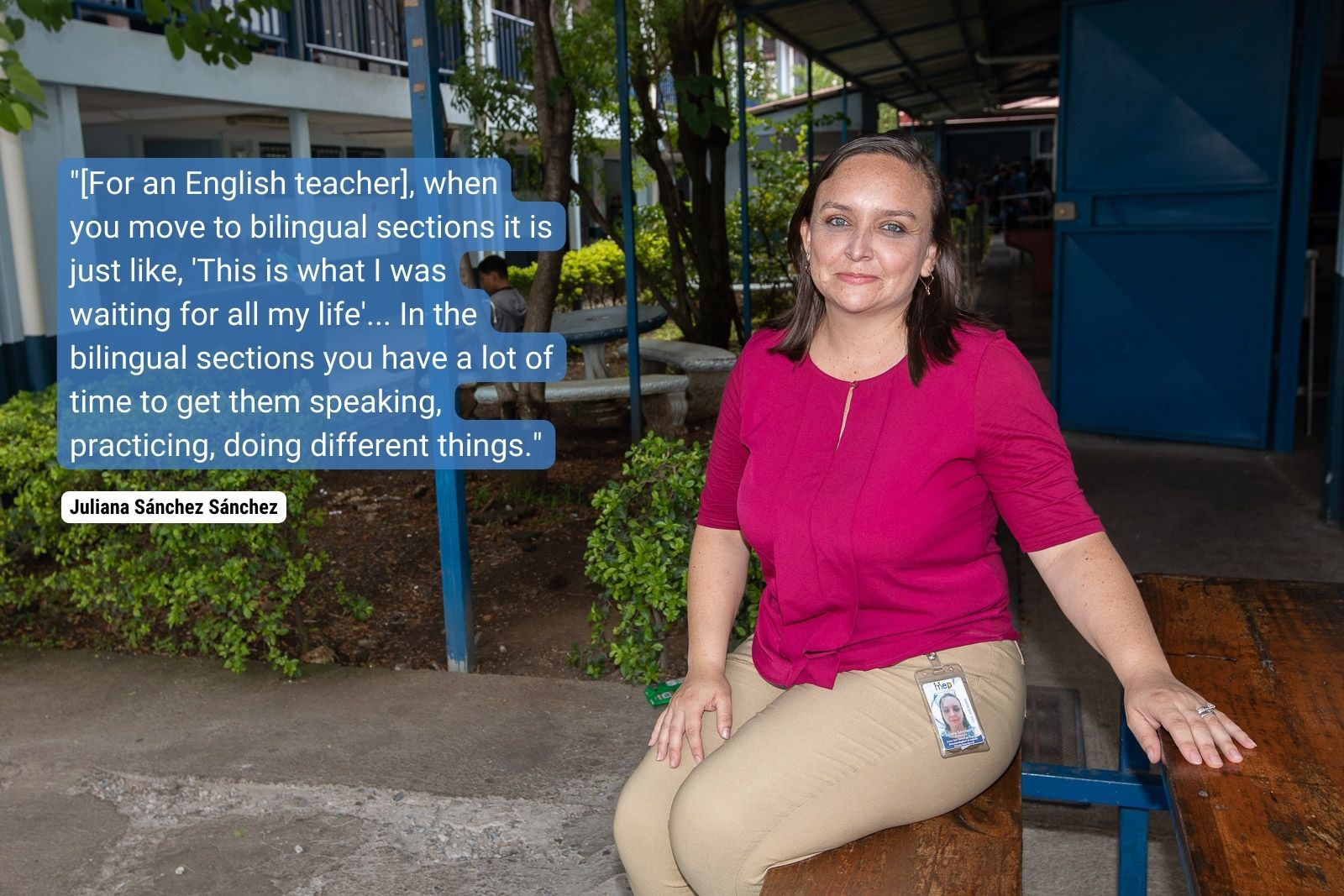 “It’s a really nice experience,” says Juliana Sánchez Sánchez, coordinator of the bilingual sections program at the high school. She’s also an English teacher for the ninth-year bilingual sections and English literature for the 10th-year bilingual sections. “Before coming here I was working in private schools, and there you teach everything: grammar and oral, separated, and one teacher has emphasis in one of the areas. But here you have to put everything together. You have to teach them real English. You have to integrate the 10 lessons they have per week. You have to teach them a little bit of this, or a little bit of grammar, like implicit grammar and different skills, and it’s really nice.”