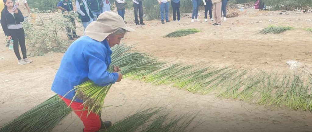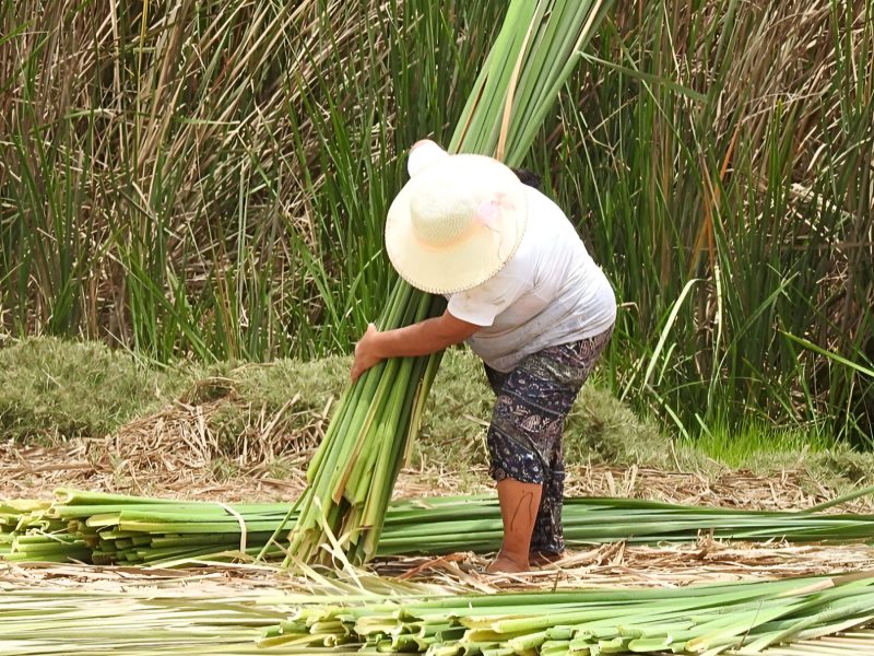 Eudocia Chunga Ruiz, one of the harvesters, explains calmly: “When the reeds are green and thin, they can’t be cut. We wait for them to mature, clean them, spread them out in the sun, and then make the bundles.”
