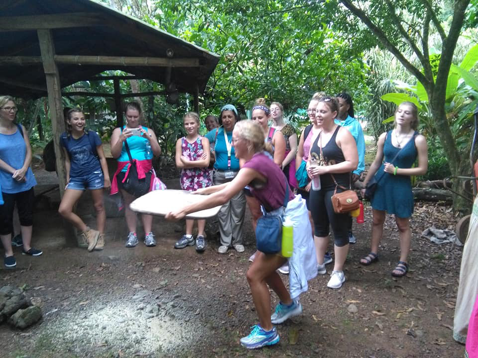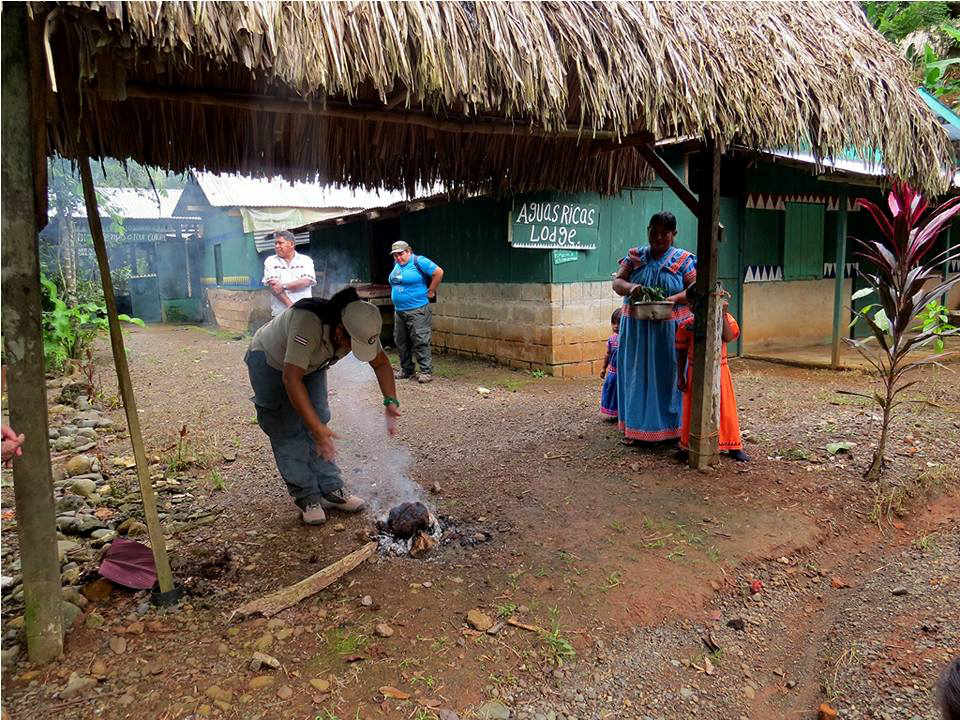 “Si llega el cliente, le enseñamos cómo la gente hacía las ceremonias para recibir a los visitantes”, dice Mariano. “Yo vendo la experiencia de lo que yo viví. Algunas cosas todavía se hacen pero ya no tienen fuerza. Les hablamos de las costumbres. También les presentamos la historia del territorio, ¿cómo está organizado? Les hablamos del Parque Nacional Corcovado. Luego vamos a hacer una caminata, que tienen diversidad de cosas que compartir: las plantas medicinales, comidas naturales, lo que haya en el sendero. Pilamos arroz en un pilón. Molemos maíz en piedra como era antes. Les damos una breve escuela de idioma”.